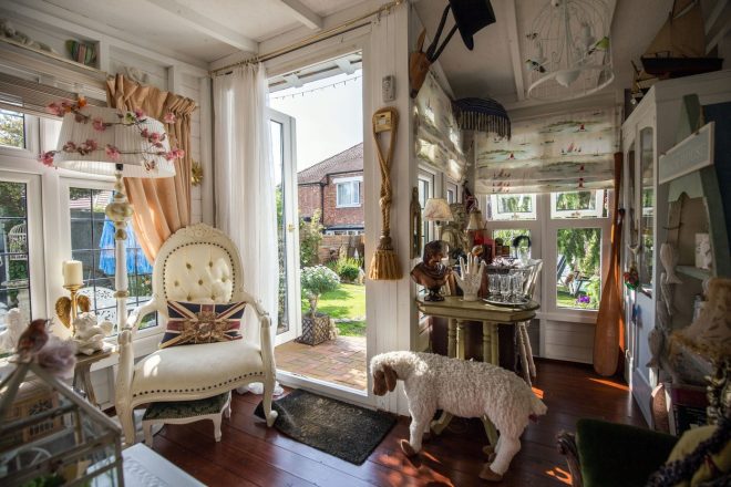 Hišica je bila moževo darilo za 50. rojstni dan in čisto sama in po svojem okusu si jo je opremila z manj kot 1000 evri. Pove: “Naša stara vrta lopa je že na pol razpadala in ko sem gledala, da bi kupili novo, je bilo vse, kar mi je bilo všeč, predrago za naš proračun. Potem pa se je moj mož ponudil, da mi jo zgradi kar sam, za 50. rojstni dan. Res si je dal duška, jaz pa sem imela v glavi le to, da jo želim opremiti s opremo, ki jo je nekdo zavrgel. Sama nameč res ne maram, da se stvari zavržejo v smeti, ampak sem zagovornik ponovne uporabe. Na koncu nas je celotna gradnja in oprema hišice stala manj kot 1000 evrov. Vse pohištvo in dekor sem kupila ali na spletu, ali na bolšjih trgih ali pa v dobrodelnih trgovinah ponovne uporabe. Najdražja stvar so bila lesena tla. Resnično uživam v recikliranju in v tem, da zavržene stvari spremenim v nekaj novega, v nekaj dragocenega.”
