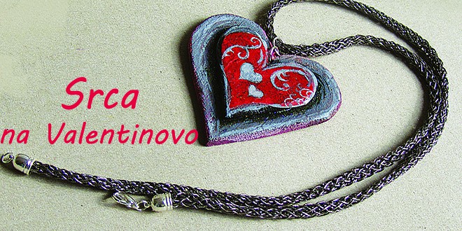 Ali pa: Iz filca izrežite dve srci, vmes všijte trak, izvezite obrobo z barvasto prejo in našijte lesketajoče koralde. Obesite k vratom.