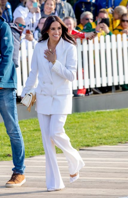 Za svoj prvi nastop v Haagu je Meghan izbrala minimalističen hlačen kostim v beli barvi znamke Valentino. Kombinirala ga je z novo it torbico tega trenutka, znamke “One Stud”, in belimi salonarji Aquazzura. Noben drug modni kos ne predstavlja ženske moči tako kot hlačna obleka. Bela barva velja tudi za simbol, ki spominja na gibanje sufražetk v ZDA na začetku 20. stoletja. Velja naslednje: Blazer naj bo širok in mora imeti izrazit predel ramen. Pozor: “Ovesize kostimi” so idealni samo za visoke ženske. Kot alternativa so kostimi, ki so prilagojeni manjšim postavam – blazerji niso overzie, ampak so krojeni tesno, tudi hlače so ozke.