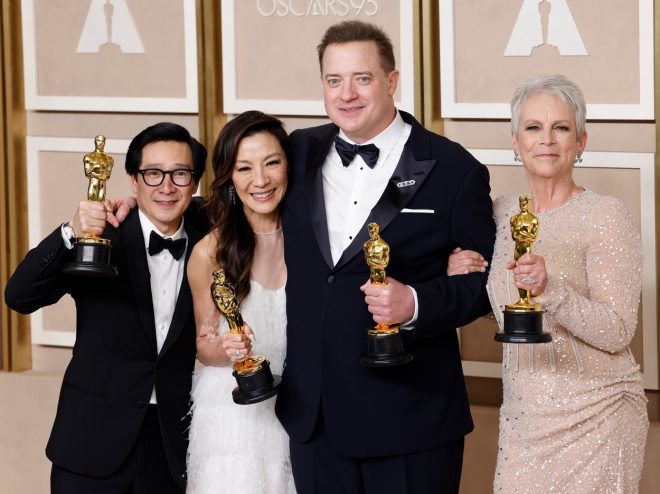 Za žanrski hibrid, ki temelji na družinski drami, Vse povsod naenkrat so oskarje osvojili tudi Daniel Kwan and Daniel Scheinert za režijo in izvirni scenarij, Michelle Yeoh za glavno žensko vlogo, Ke Huy Quan za stransko moško vlogo, Jamie Lee Curtis za stransko žensko vlogo in Paul Rogers za montažo filma.