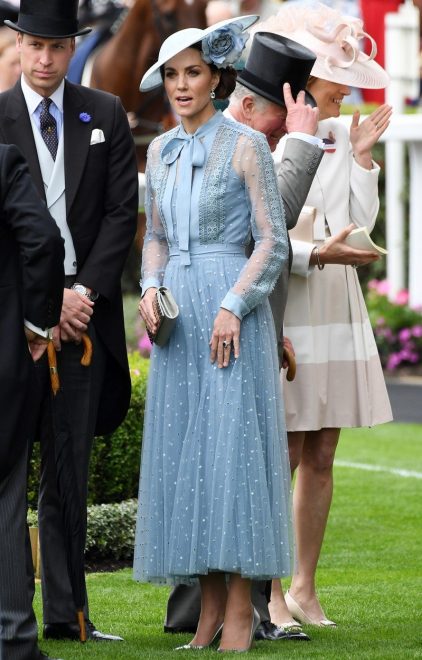 Kate Middleton je bila na dogodku Royal Ascot prelepa v modrem! Nosila je modro obleko Elie Saab s tako imenovanim “pussy bow” ovratnikom, stajlig pa je dopolnila s srebrnimi visokimi petami, visečimi uhani oblikovalke Kiki McDonough in klobuk svojega najljubšega oblikovalca klobukov Philipa Treacyja. Kate je bila v modrem videti kot iz škatlice, izjemno ženstvena in elegantna.