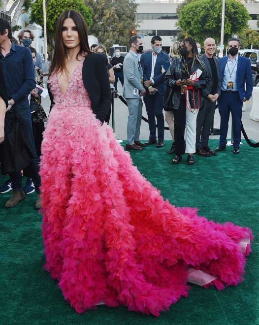 Oskarjevka Sandra Bullock se je v ponedeljek udeležila premiere Izgubljenega mesta v gledališču Regency Village v soseski Westwood v Los Angelesu, in za to priložnost je oblekla voluminozno roza ombre obleko z globokim dekoltejem in visokim razporkom. Lepotica, rojena v Virginiji, ki odlično kljubuje svojim 57. letom, pa je za še bolj dramatičen videz pompozno obleko kombinirala s črnimi usnjenimi visokimi škornji in bolero blazerjem, ki ga je izbrala stilistka Elizabeth Stewart.